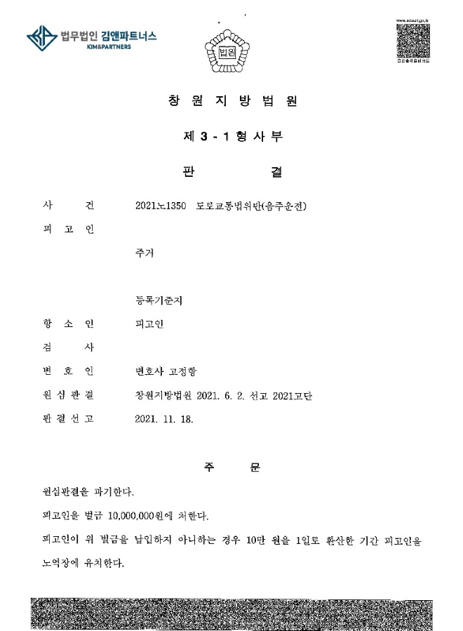 이러한 본 변호사의 충실한 조력의 결과 법원은 의뢰인이 과거 동종 전과로 음주운전을 한 경력이 있었다는 점을 지적하면서도,