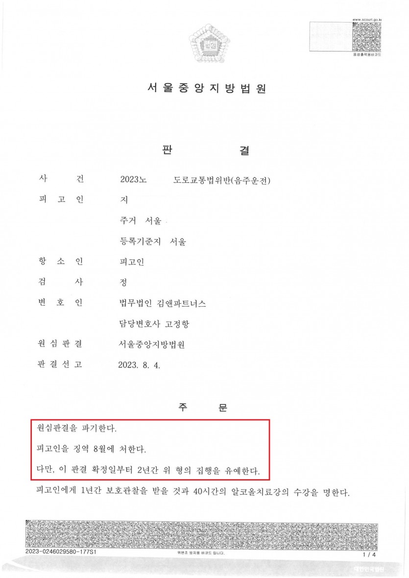 의뢰인은 종전 2번의 전과가 있었으며, 1심에서 실형 1년을 선고받고 항소심에서 고정항변호사를 선임하였습니다. 종전의 전과가 집행유예였으므로 1심의 실형이 결코 과다한 것은 아니었습니다. 고정항변호사는 항소심에서 피고인이 평소 살아온 과정, 학력, 직업, 운전의 경위 등 피고인에게 특수하게 존재하는 사정을 강력히 어필하여 항소심에서 집행유예로 석방되어 가족과 사회의 품으로 돌아갈 수 있었습니다. 종전의 전과가 집유이고 1심에서 실형을 선고받았다고 하더라도 항소심에서의 변론을 통하여 집유를 받을 수도 있으므로 섣불리 항소를 포기해서는 안됩니다.